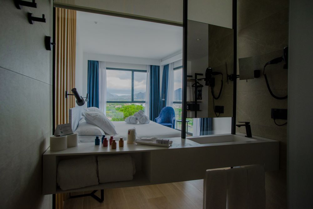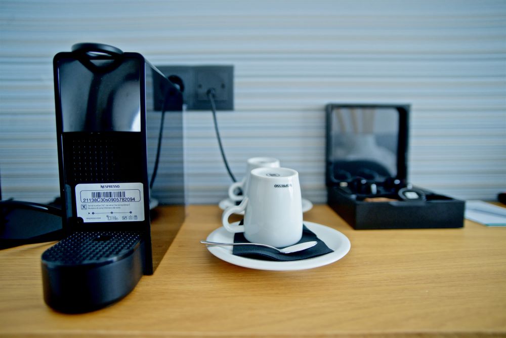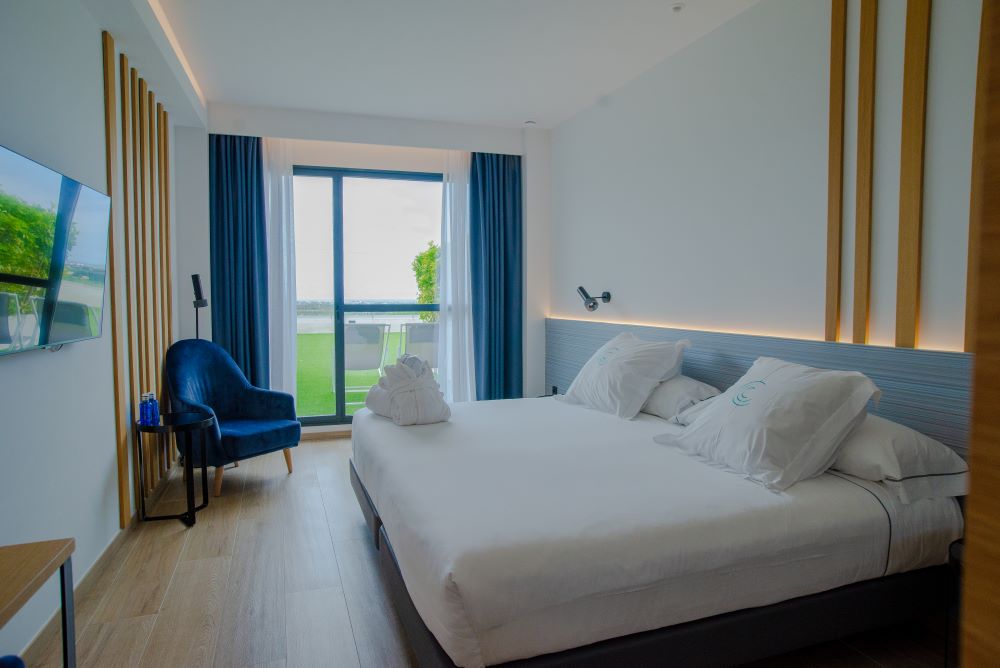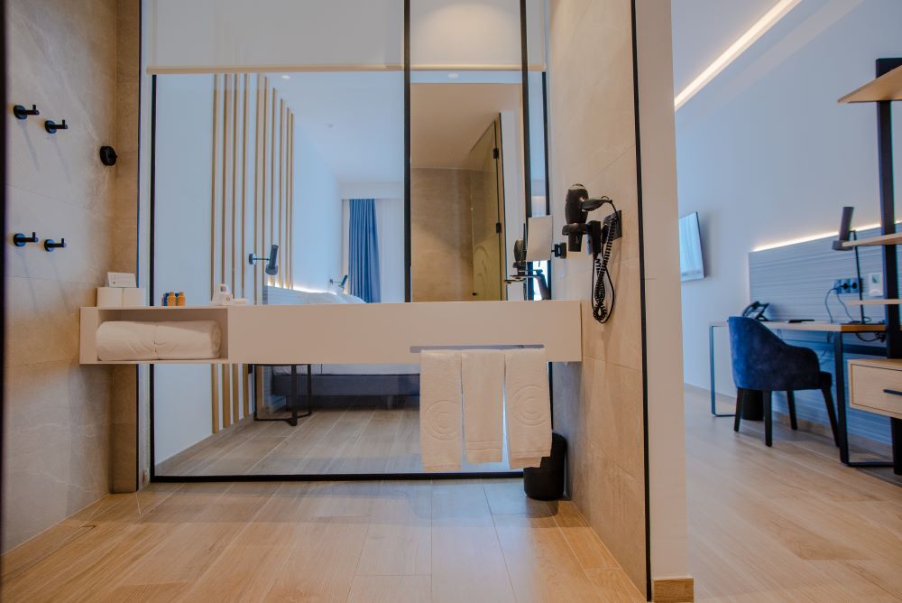 - Baño privado moderno con amenities premium, secador de pelo, albornoz y zapatillas, caja fuerte, nevera y cafetera con cápsulas de café