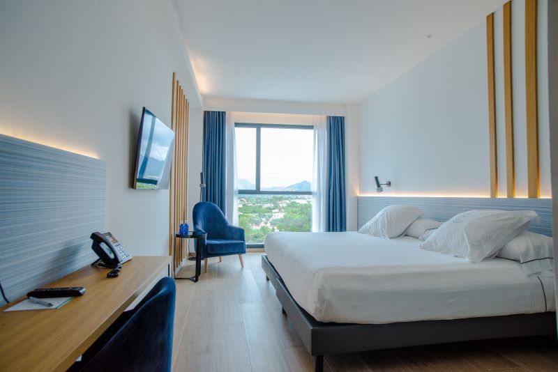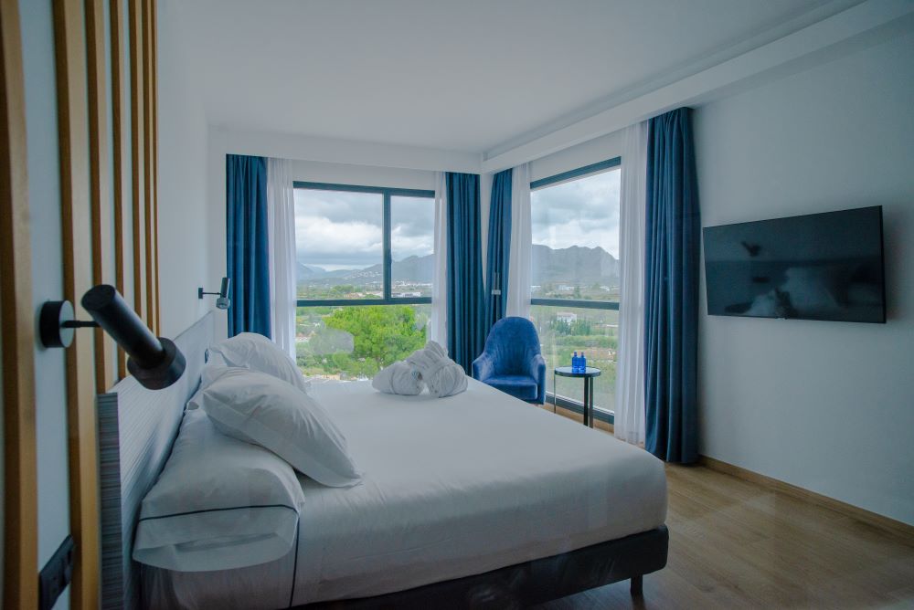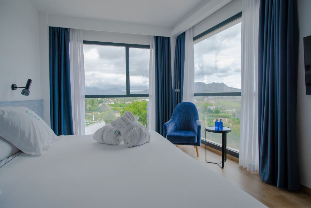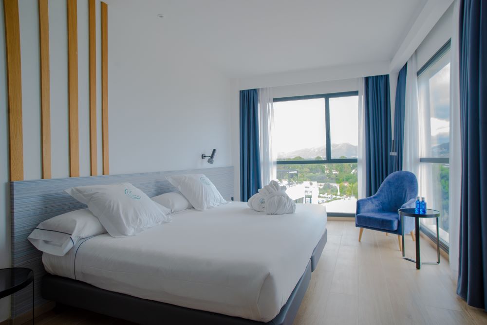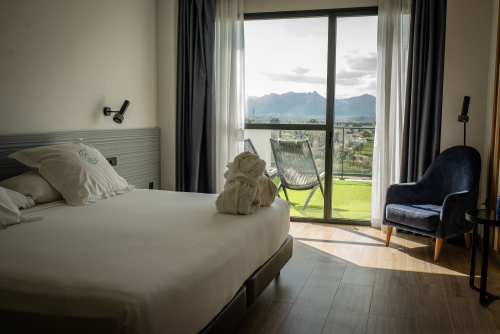 Elija una cama doble extragrande (240 × 200 cm) o dos camas individuales (120 × 200 cm), con vistas al mar y a la montaña según la orientación.
