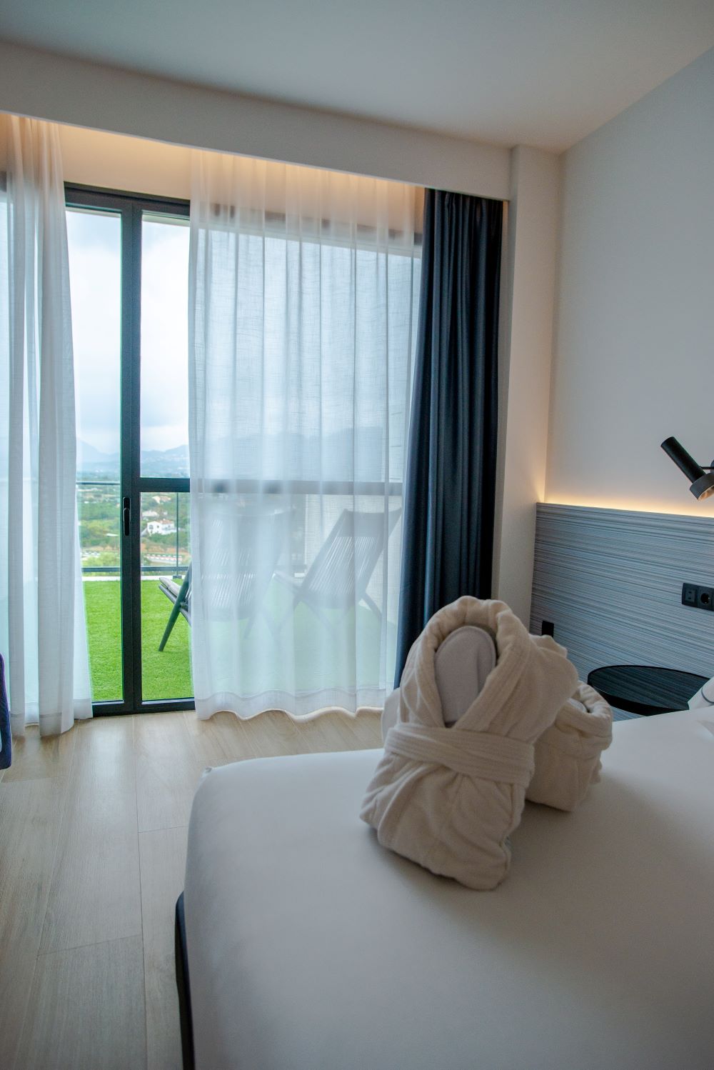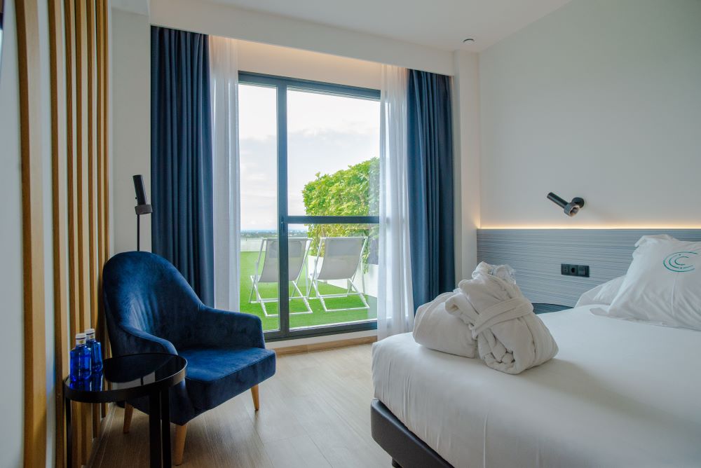 - Disfrute de una cama doble extragrande (240 × 200 cm) o camas twin (120 × 200 cm) con acceso directo a una terraza privada que ofrece impresionantes vistas al mar o a la montaña.