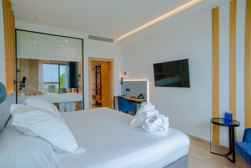 - Con 34 m², esta elegante habitación está diseñada para huéspedes que valoran la comodidad y la serenidad. Puede elegir entre una cama doble extragrande (240 × 200 cm) o dos camas individuales (120 × 200 cm), y disfrutar de vistas panorámicas al mar y a la montaña desde la comodidad de su habitación.